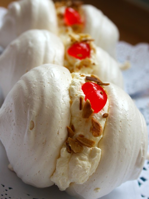 These were my brother’s favourite sweet. When I was a child my older brother was seriously ill and had spent several years in hospital, then towards the end of his stay he would be allowed home for the weekend. Of course everything at home had to be perfect for these weekend visits. All his favourite meals were prepared and an order to the local baker would be placed for a box of fresh cream meringues. These involved two plump oval meringues sandwiched with fresh cream topped with a cherry, a sprinkling of nuts and then packed with five others into a white cardboard box, which was then tied up with red ribbon.