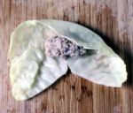 Take one cabbage leaf and with a sharp knife cut any large tough veins out. Place a walnut sized piece of mince and rice mixture into the middle. Bring up the sides and roll.