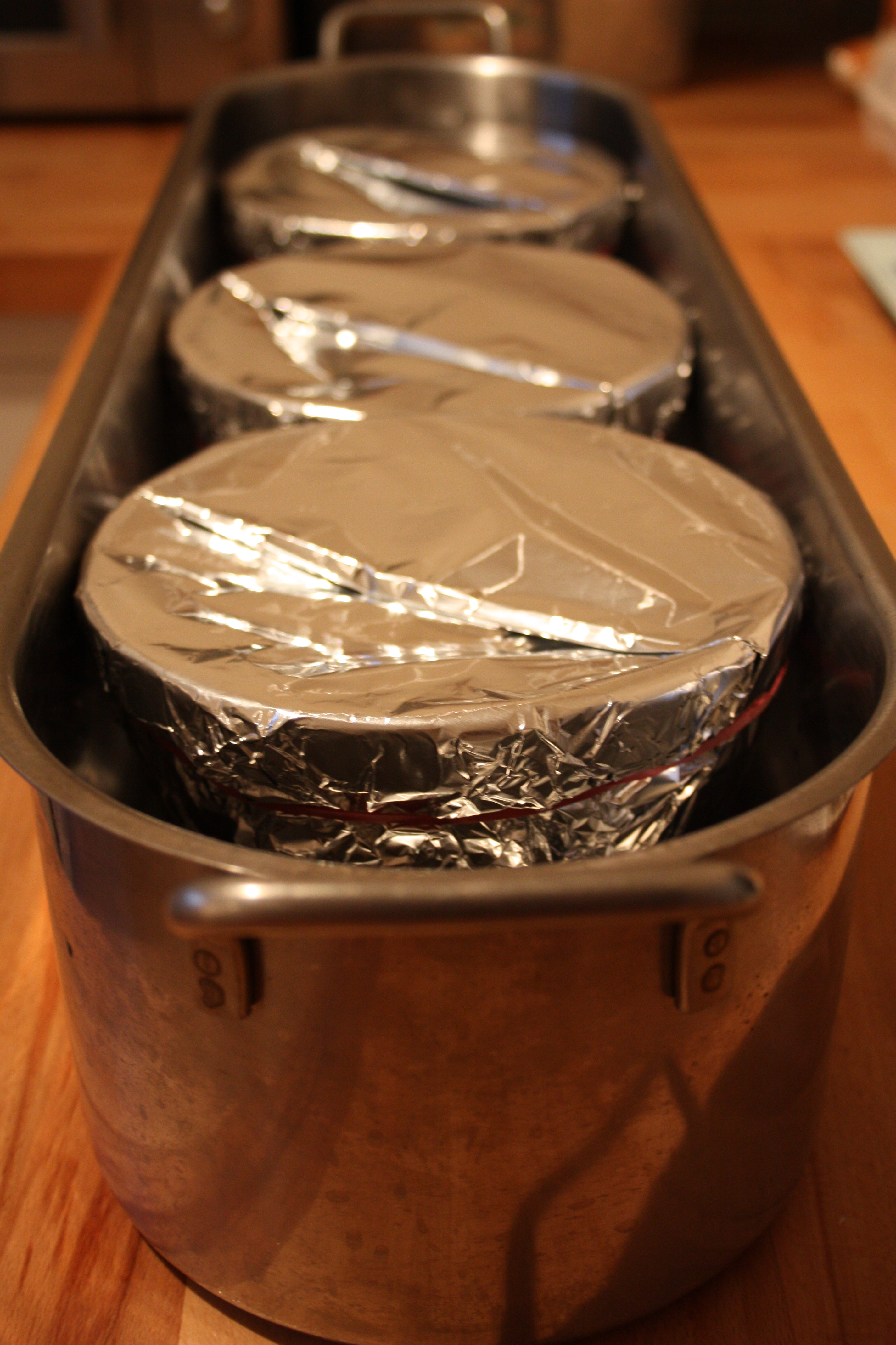 Drop the mixture on top of the golden syrup leveling out before placing the lid on. It should come to about half way up the basin.